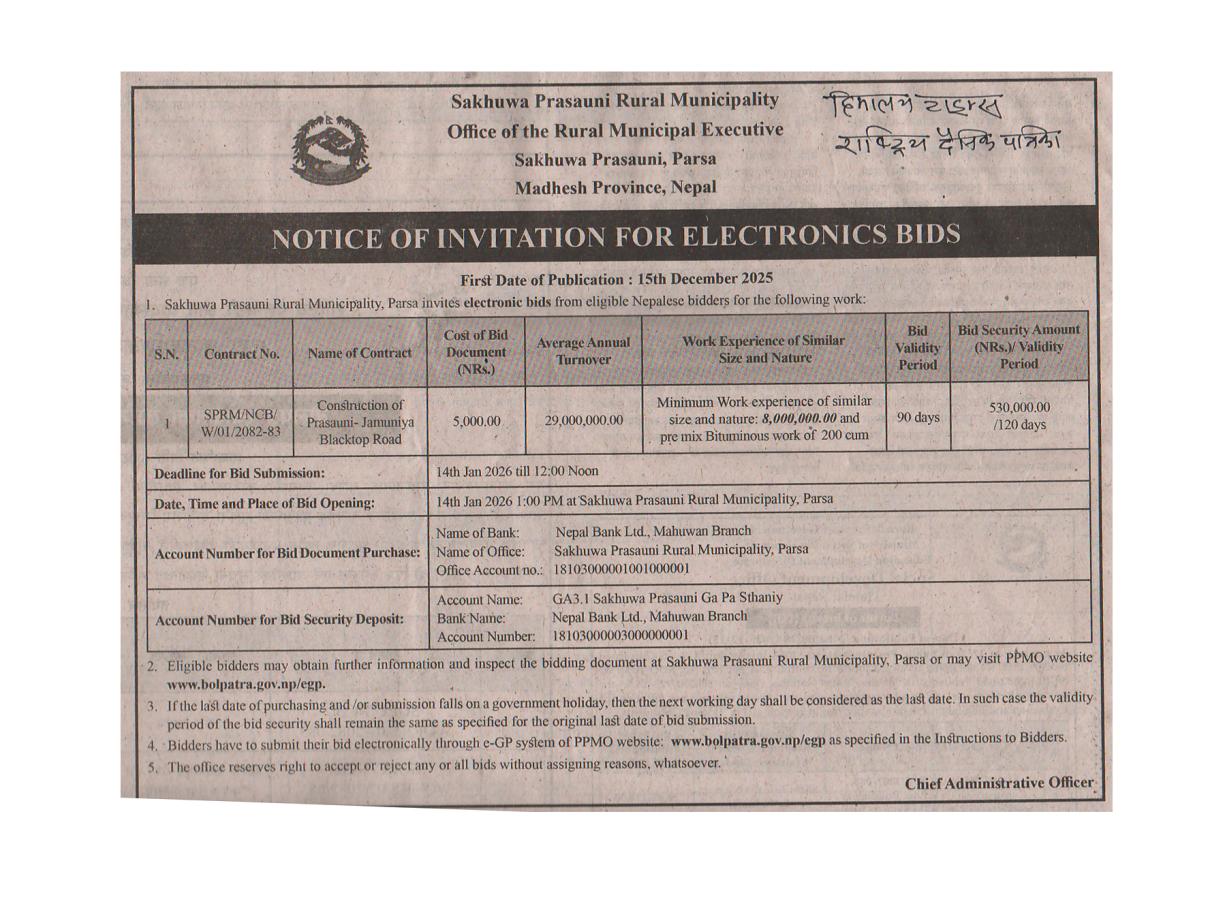 Invitation for Electronic Bids (Hulaki Sadak dekhi Ekdarwa gaun ko dakshin nahar samm sadak kalopatre)