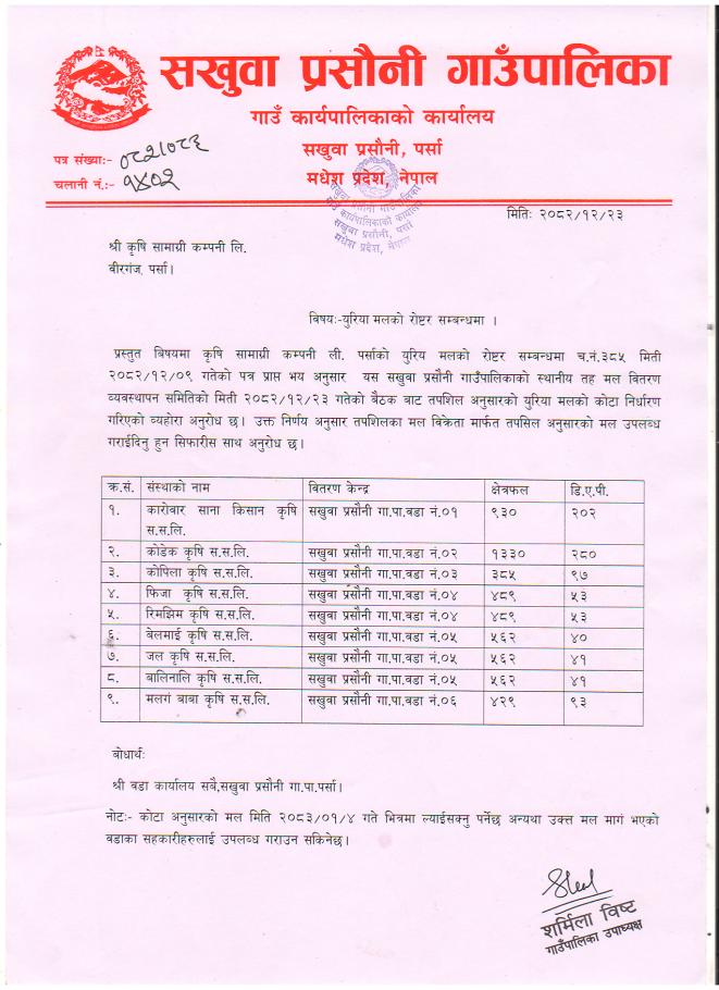 युरिया मलको रोष्टर सम्बन्धमा ।