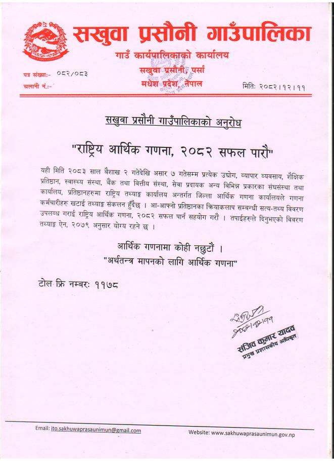 सखुवा प्रसौनी गाउँपालिकाको अनुरोध । "राष्ट्रिय आर्थिक गणना, २०८२ सफल पारौ"