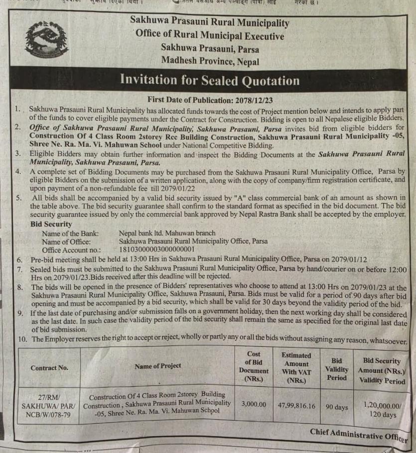 » Invitation of Sealed Quotation - Construction of 4 classroom 2 storey building