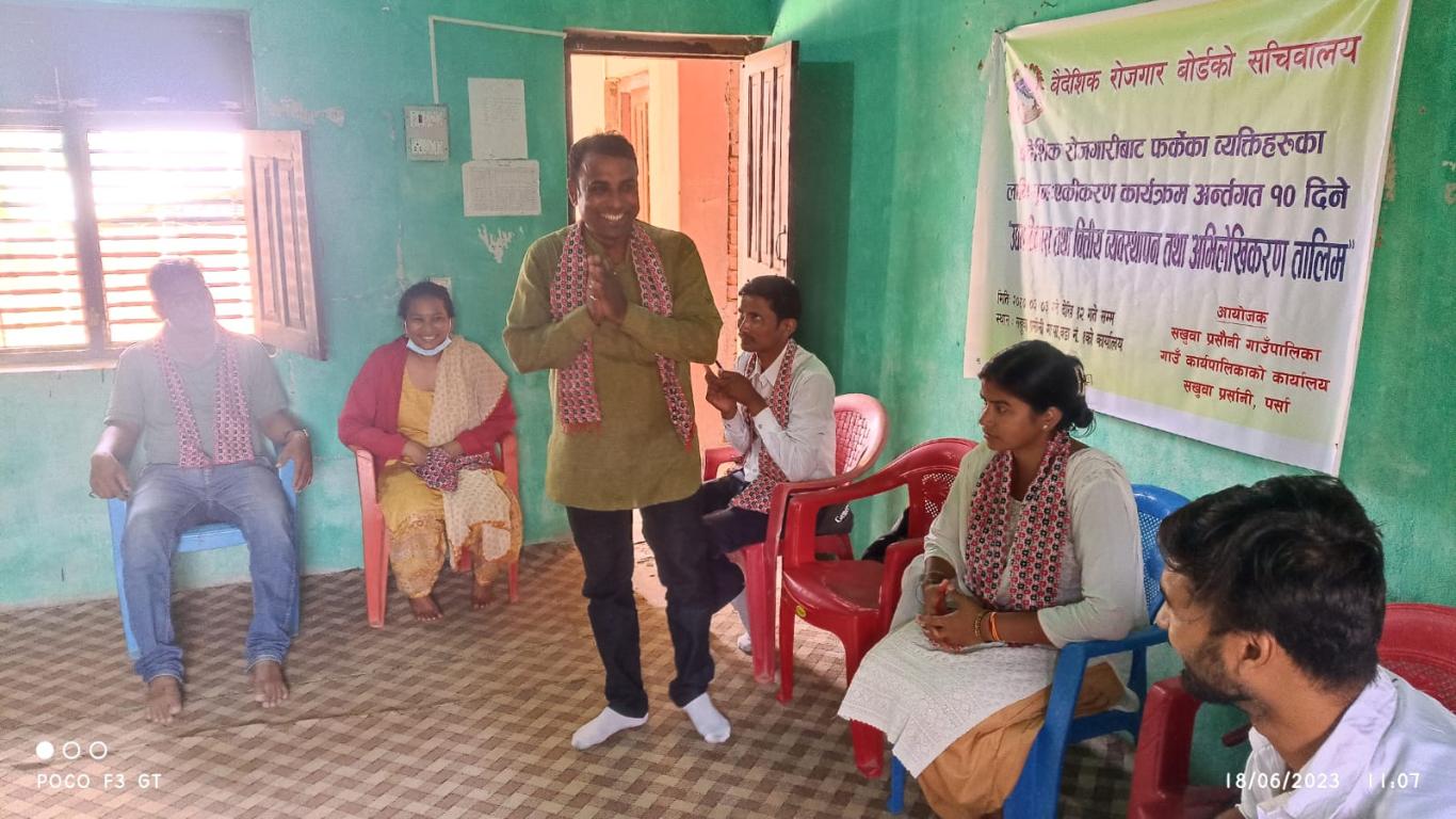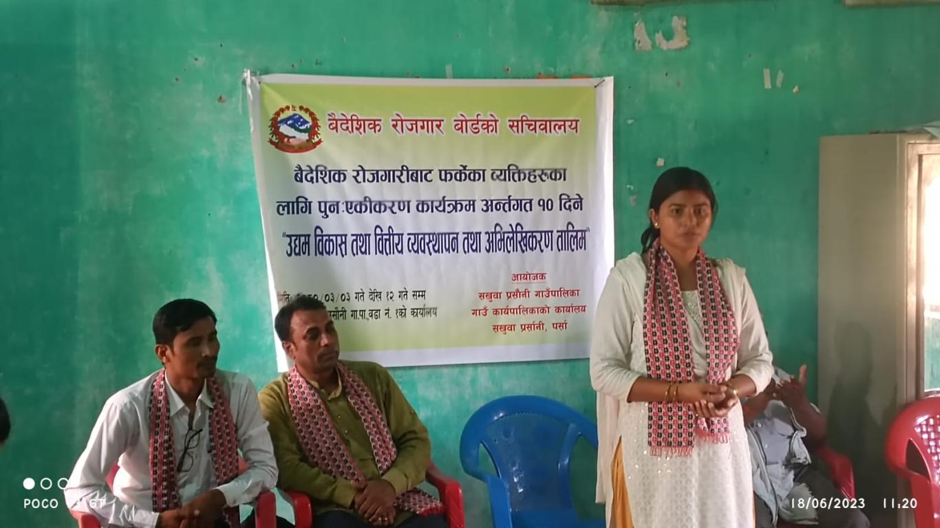 बैदेशिक रोजगारीबाट फर्केका व्यक्तिकहरुका लागि पुन:एकीकरण कार्यक्रम अन्तर्गत १० दिने उद्यम विकास तथा वित्तिय व्यवस्थापन तथा अभिमुखिकरण तालिम ।