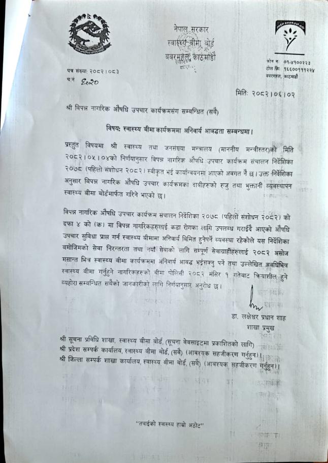 स्वास्थ्य बिमा कार्यक्रममा अनिवार्य आबद्धता सम्बन्धमा।