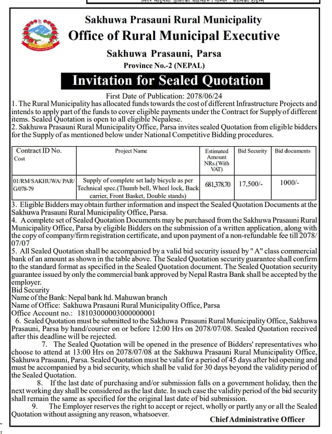 about Invitation for Sealed Quotation - Supply of complete lady bicycle
